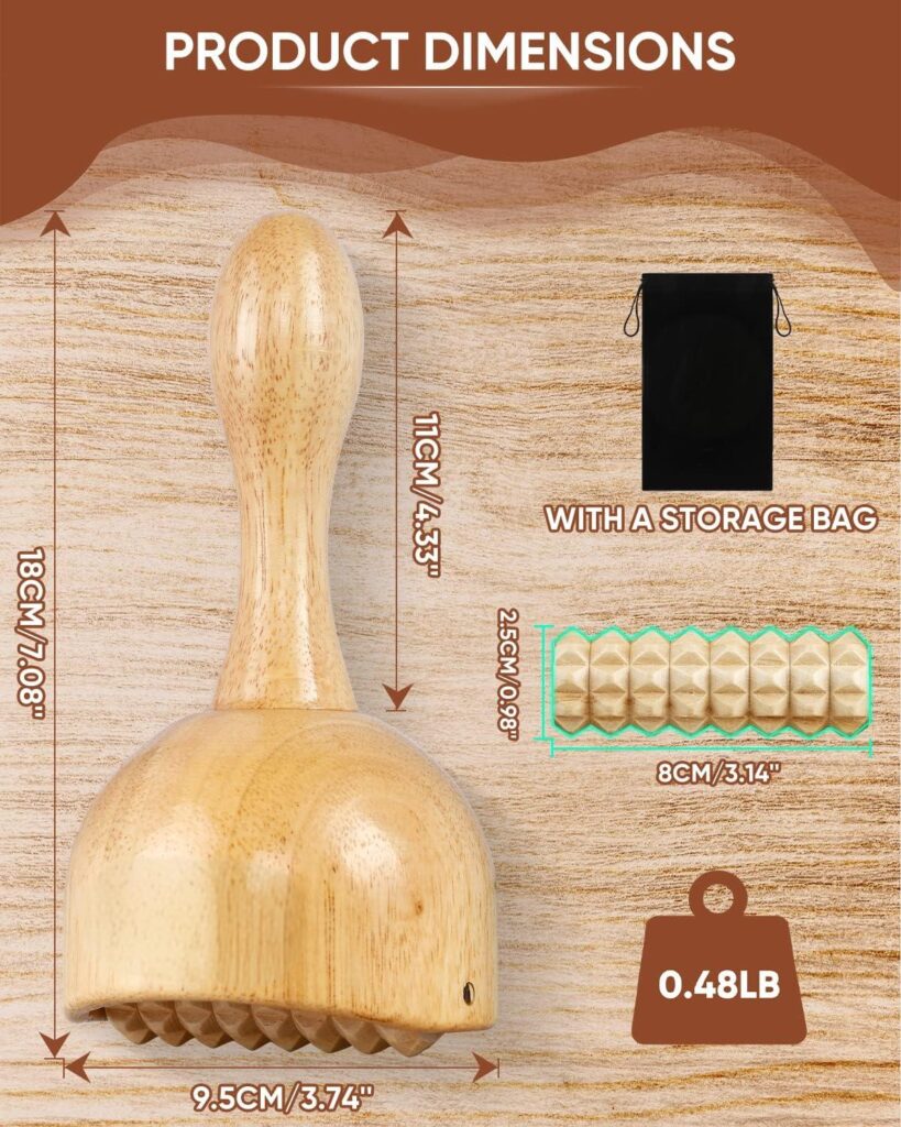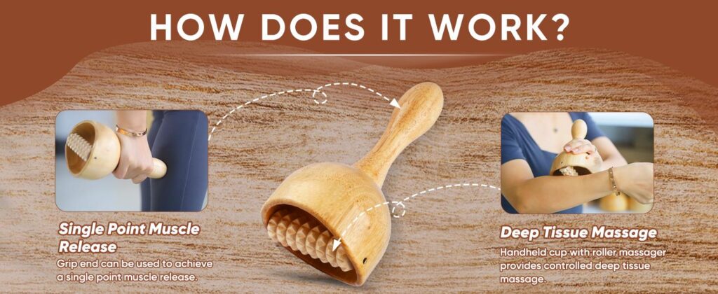 Roll the wooden therapy cup with roller over the skin for a deep tissue massage.